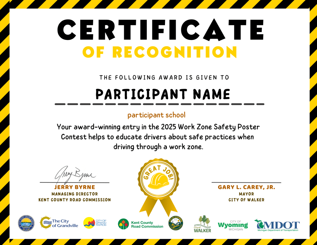 Graphic Design. Certificate of Recognition for Work Zone Safety Poster Contest Winners